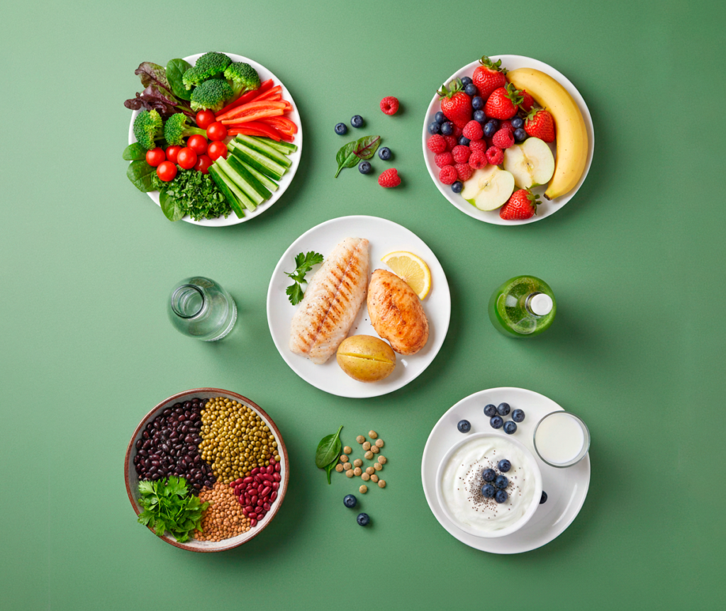 птица, рыба, яйца, творог, бобовые. Плюс овощи и умеренная порция крупы или картофеля.
